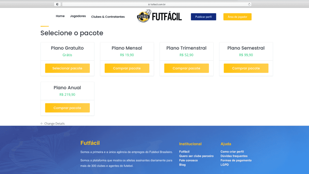 Após configurar seu anúncio, escolha a melhor forma de pagamento e finalize o processo. Seu perfil ficará ativo para que clubes e treinadores possam encontrá-lo!